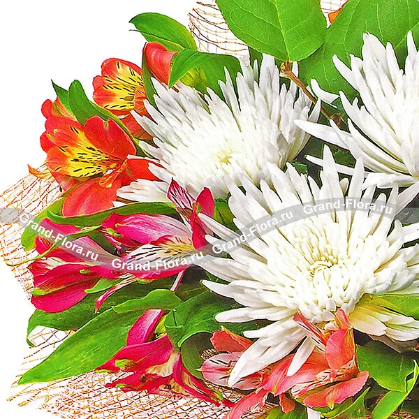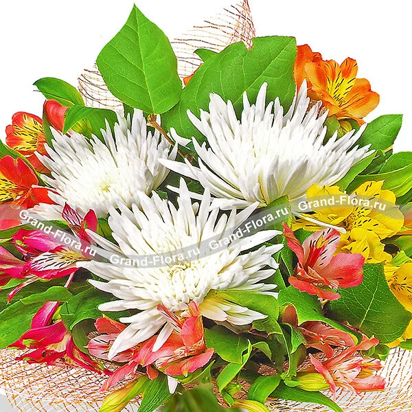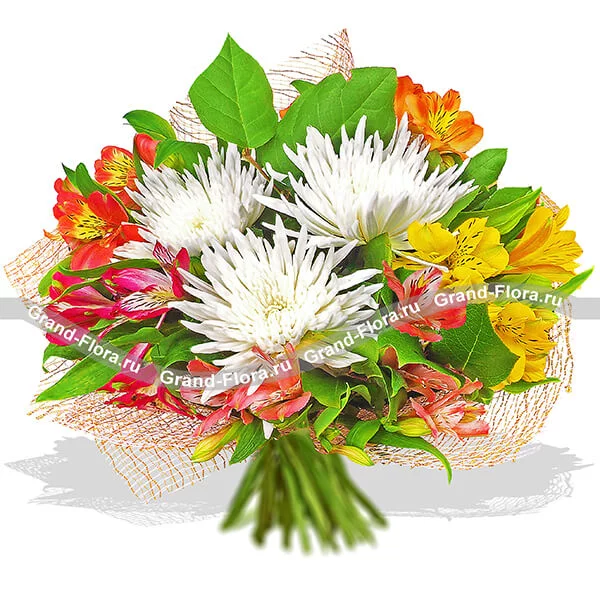 Стандартный: хризантема белая игольчатая - 5 шт., альстромерия желтая - 1 шт., альстромерия оранжевая - 1 шт., альстромерия розовая - 2 шт., альстромерия малиновая - 2 шт., декоративная зелень, сетка розовая.