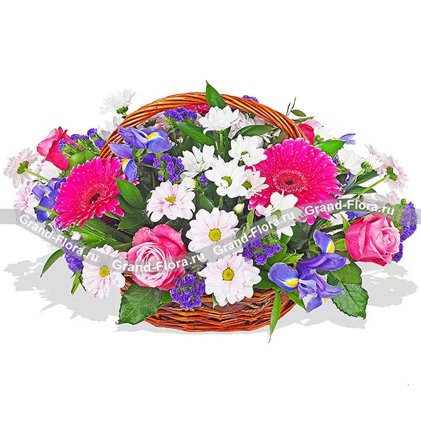 Стандартный (на фото): роза розовая - 4 шт, гербера малиновая - 3 шт,  ирисы - 5 шт, хризантема кустовая светлая - 4 шт, статица - 2 шт, рускус, оазис, корзина.